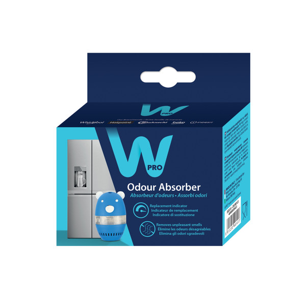 Pohlcovač zápachu Wpro absorbuje a odstraňuje z vaší chladničky nepříjemné pachy, jako například z ryb, sýrů nebo zeleniny. Vydrží 3 měsíce; spotřeba gelu indikuje životnost. Pohlcovač zápachu je vyroben z následujících látek: vysoce absorbující aktivní uhlí a netoxický gel, který nemění chuť ani vůni vašich potravin.